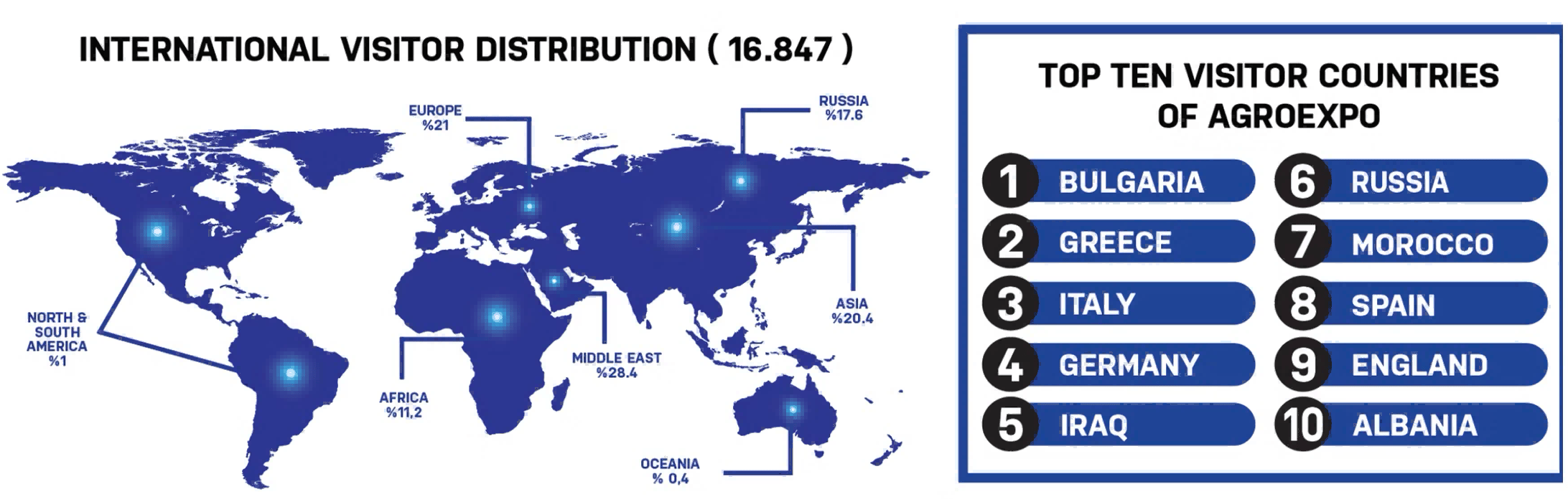 2025年,第20届土耳其伊兹密尔国际农业展共设有14个展馆,600家展商、共计33万平米(室内22万平米、此中国际展商,来自土耳其,巴基斯坦,巴勒斯坦,英国,,约旦,阿塞拜疆,俄罗斯,中国,,,埃及,美国,日本,哈萨克斯坦等75个国度。配件,,棉花机械,喷雾器,灌溉,温室等产物。